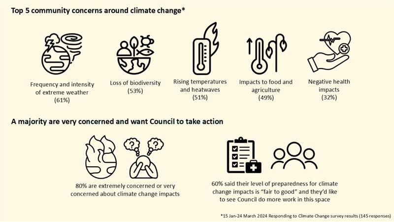 - Almost 60% of respondents stated that their level of preparedness for the impacts of climate change is 'fair to good' and that they'd like to see Council do more work in this space.