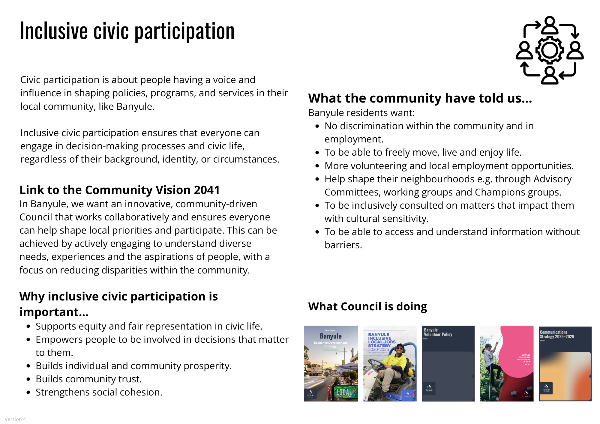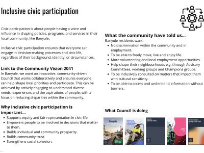 All of this work improved how we operate, made services and places more inclusive, and created a strong starting point for the next stage of the Inclusive Banyule Plan (2026–2033).