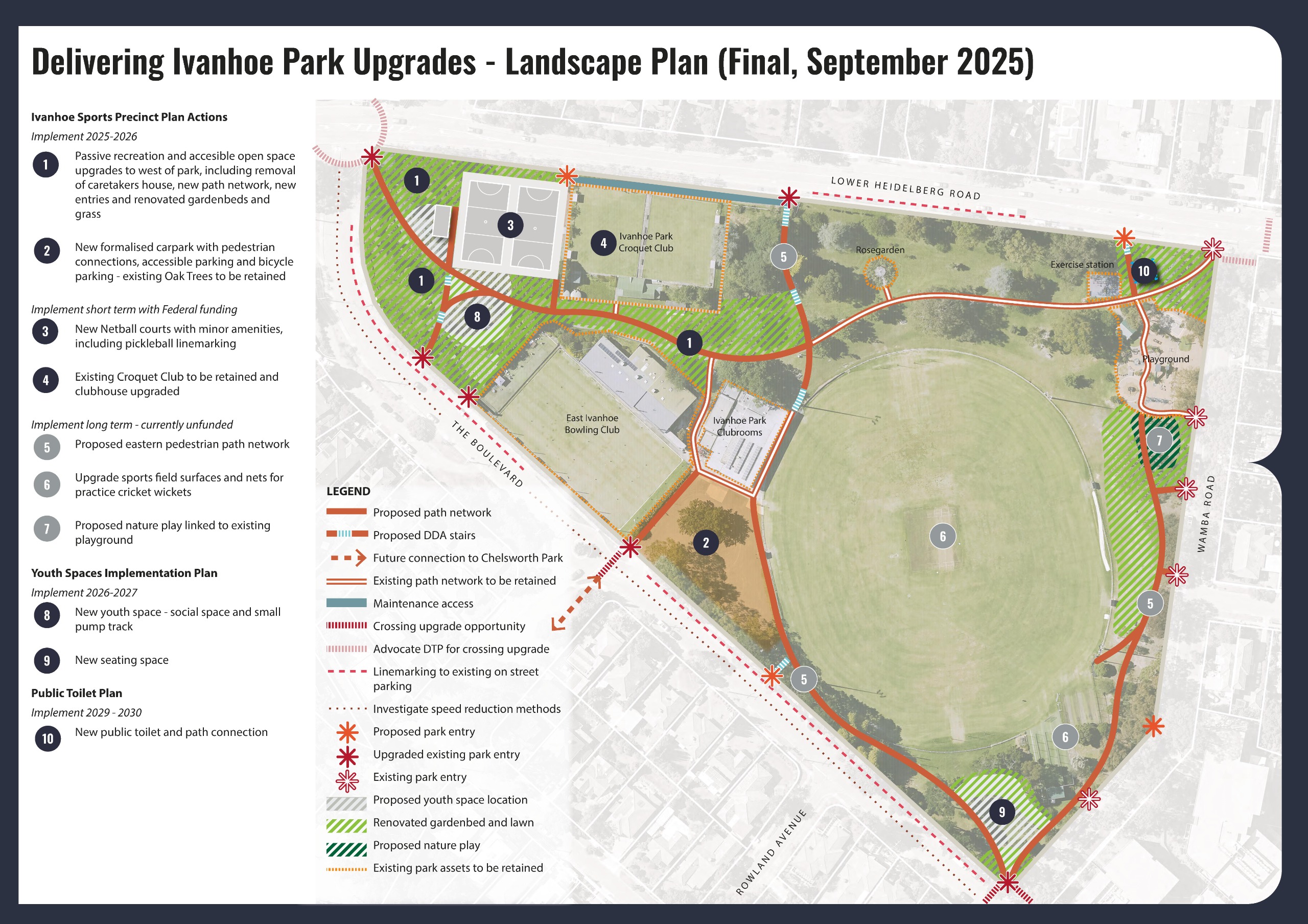 Council is going to deliver upgrades to Ivanhoe Park as part of the Ivanhoe Sports Precinct Plan and the Banyule Youth Space Plan. We heard from community during the development of these plans and are now ready to bring them to life.