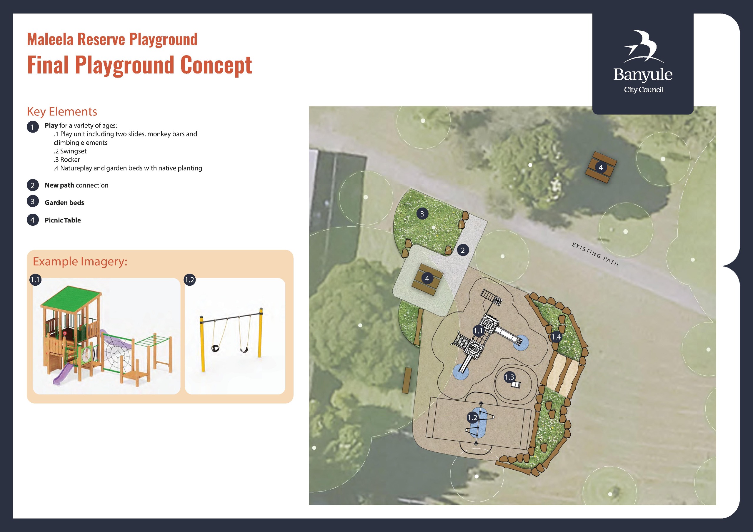 The draft playground concept reflects local knowledge and ideas shared with us during Stage 1 engagement in mid-2025. Your feedback told us that Maleela Reserve playground is important and well used by the community.